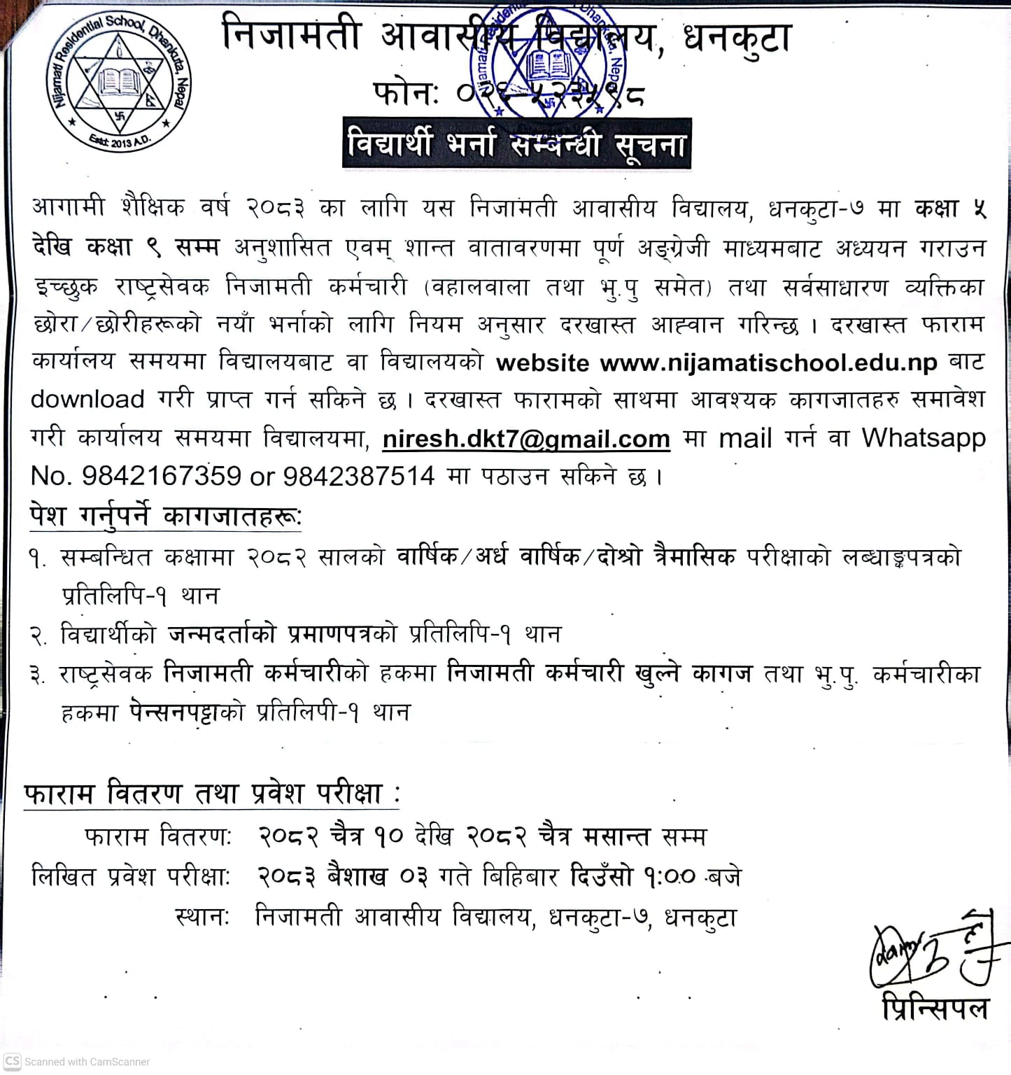 निजामती आवासीय विद्यालय, धनकुटामा विद्यार्थी भर्ना सम्बन्धी सूचना।